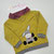 Sonnengelber Schalkragenpullover mit aufwendig gestickter Applikation.
